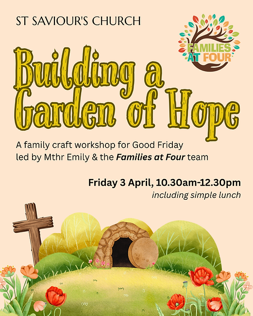 Led by the team from Families at Four children, parents and carers explore the Easter story and help create the Easter Garden with a simple lunch to follow.